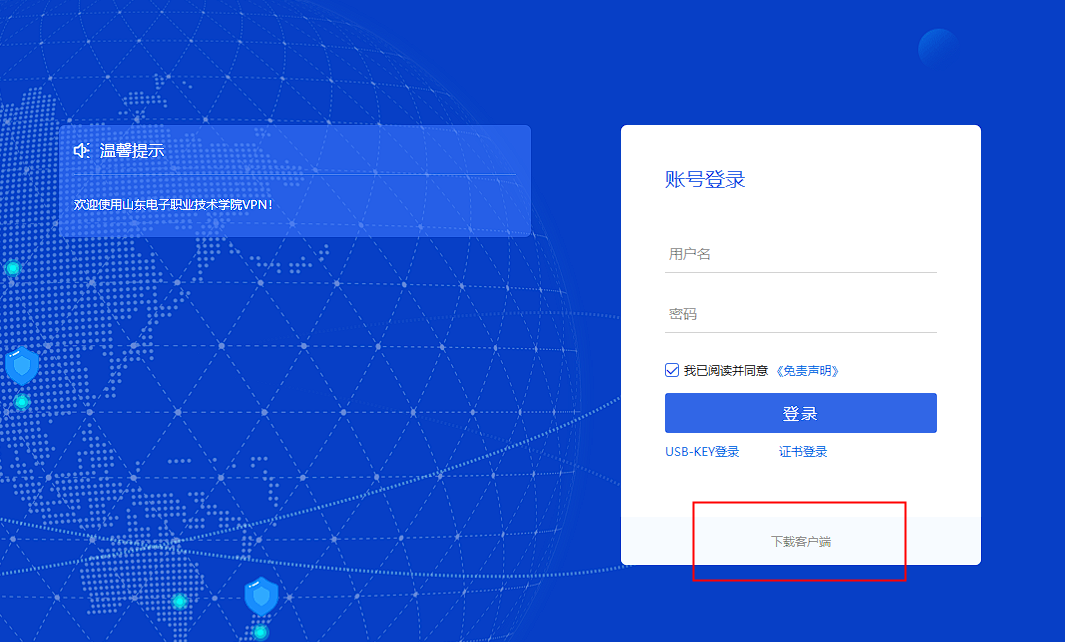1.使用电脑浏览器输入https://vpn.sdcet.cn,点击下载客户端