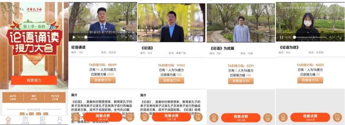 这是山东电子职业技术学院基础教学部崔老师作为阅读引领人,结合中华优秀传统文化课程,发动学生参与《论语诵读接力大会》,开展的学校“读之春”全民阅读活动。两周内,已有三百五十多名学生发起传递,在孔子网上传自己的诵读视频。