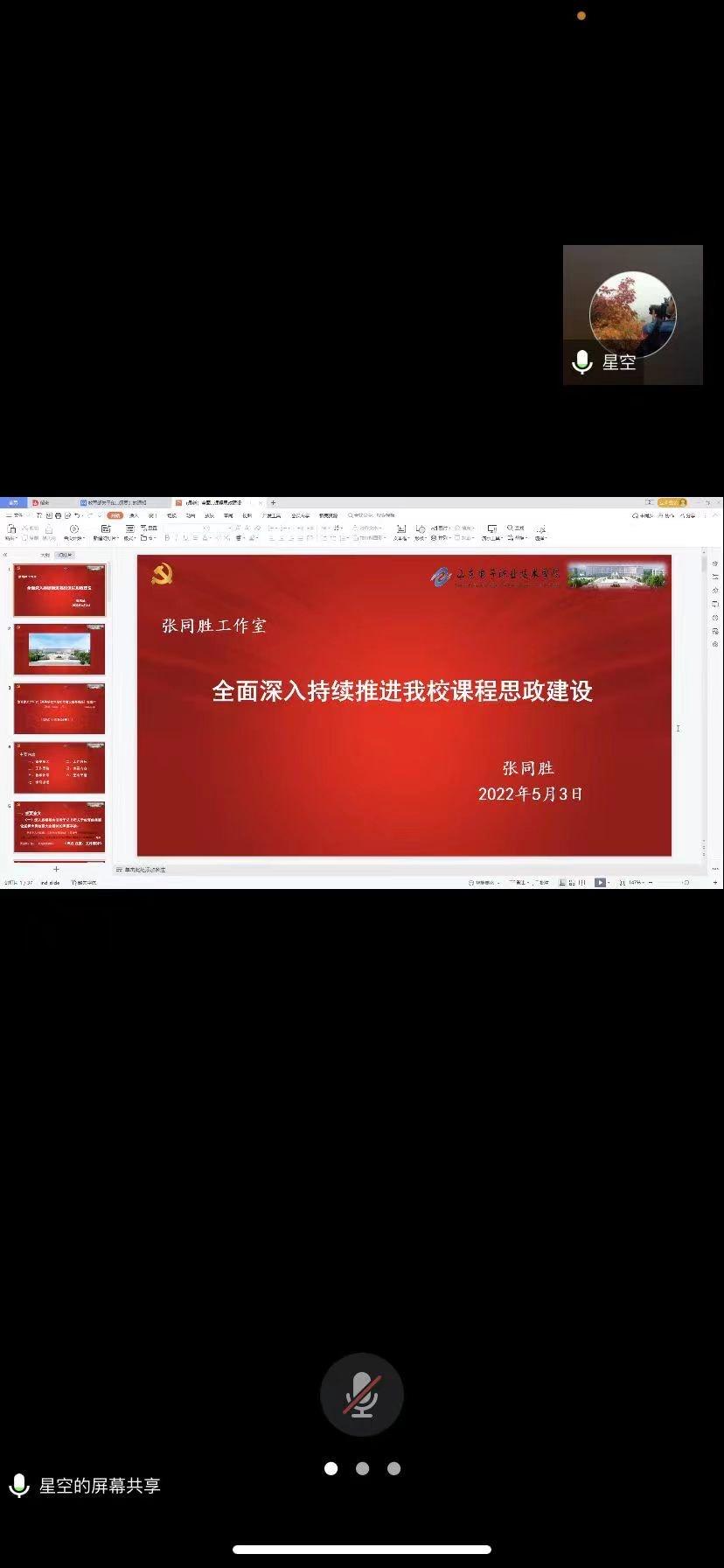 根据学校工作安排,进一步推进我校课程思政建设,5月3日下午,思政部组织召开“全面深入持续推进我校课程思政建设”线上会议,思政部全体教师参加。