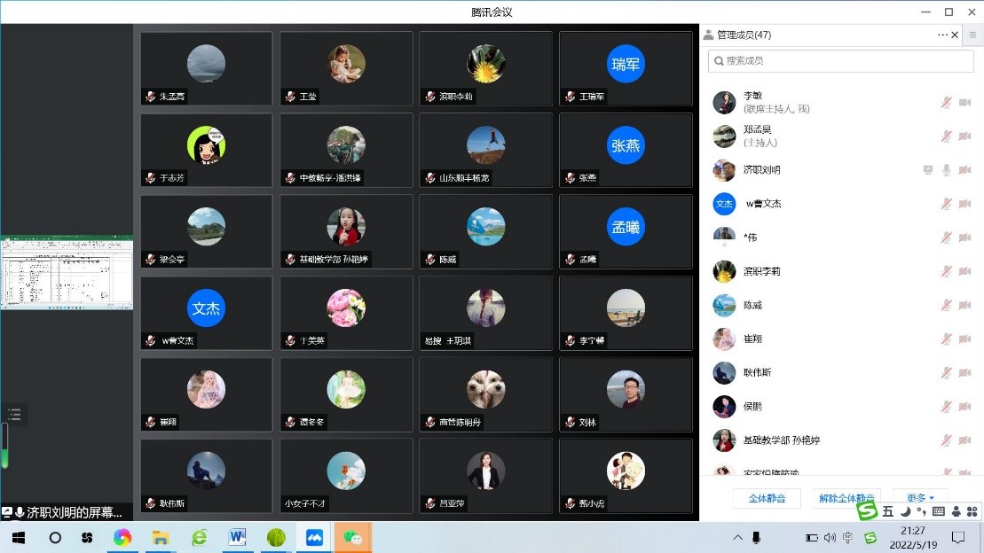2022年5月19日晚,商务管理系举行了2022年人才培养方案在线论证会,会议邀请了滨州职业学院信息工程学院院长李莉、山东省电子商务协会秘书长于登杰、中教畅享科技有限公司南京分公司总经理潘洪峰等16位兄弟院校、行业协会、企业代表,学院副院长梁会亭、教务处处长、思政部主任及基础部科长、商务管理系全体干部和教师参加了本次会议,会议由商务管理系主任主持。