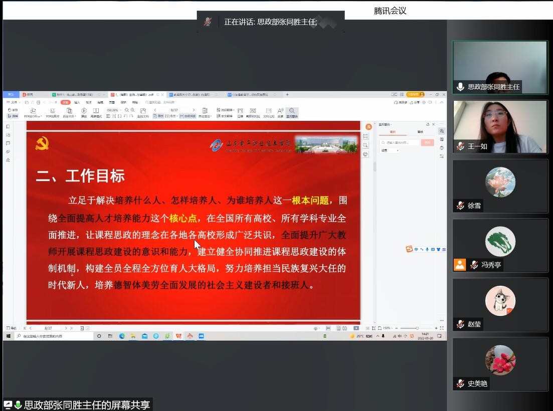 首先,王一如对思政部和基础部专家在百忙之中能够来参加会议表示感谢,随后详细介绍了数字媒体专业群的各个专业的情况,总结了前期根据学校要求对2022级人才培养方案修订所做的工作。张同胜、孙艳婷先后从专业角度认真审核了数字媒体专业群各专业的公共基础课的设置情况,包括公共基础课、公共限选课、公共任选课等各个部分。随后,张同胜对课程思政建设做了非常精彩的报告,大家对课程思政有了更加深刻的认识。
