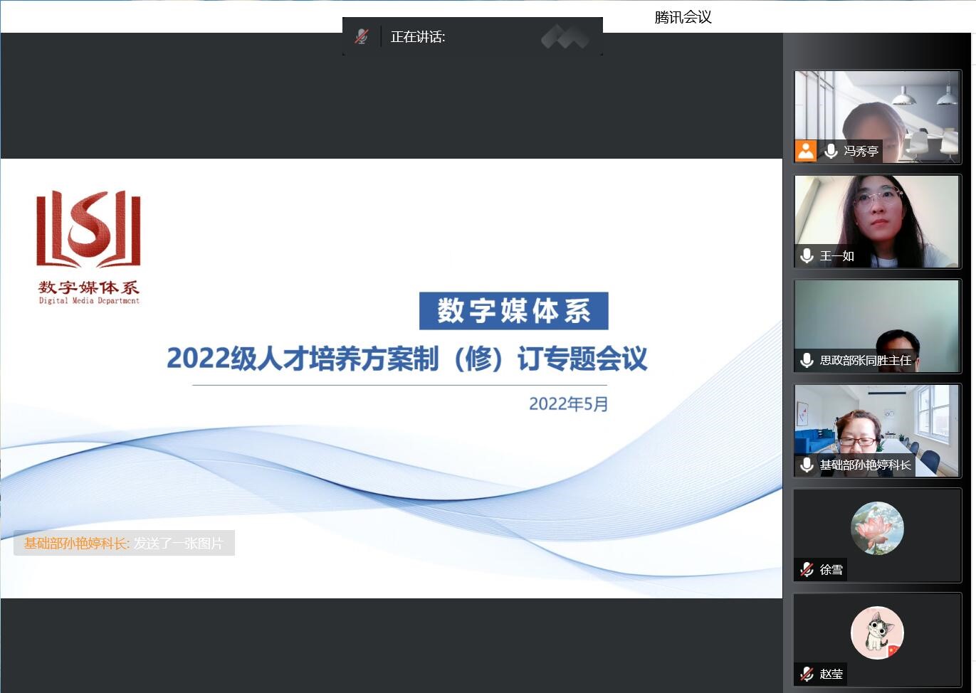 为牢固树立新发展理念,优化专业布局与课程设置,更好服务数字媒体市场需求,提高人才培养质量,5月20日下午,数字媒体系召开了2022级人才培养方案修订专题线上会议。会议邀请思政部主任张同胜、基础部教学科科长孙艳婷参加,数字媒体系副主任王一如、及全体专业负责人、系教学委员会全体委员参会,会议由冯秀亭主持。