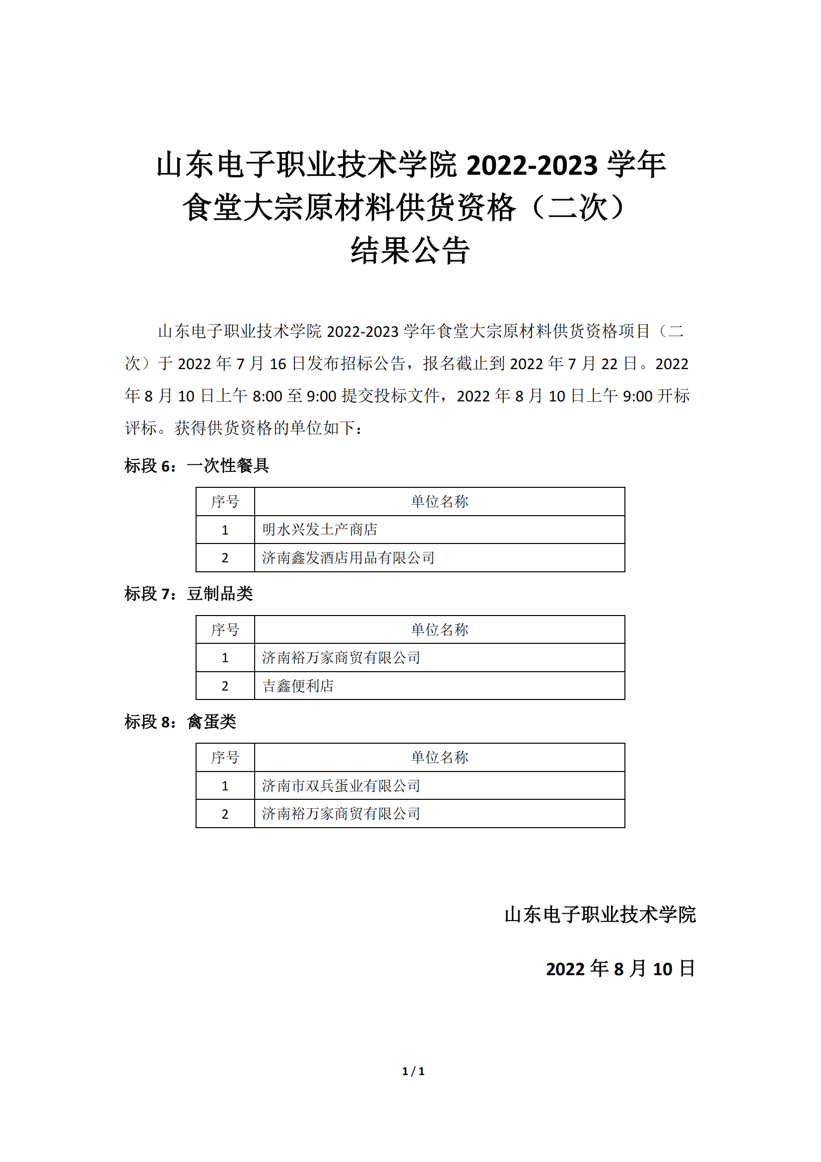 山东电子职业技术学院 2022-2023 学年食堂大宗原材料供货资格(二次)结果公告