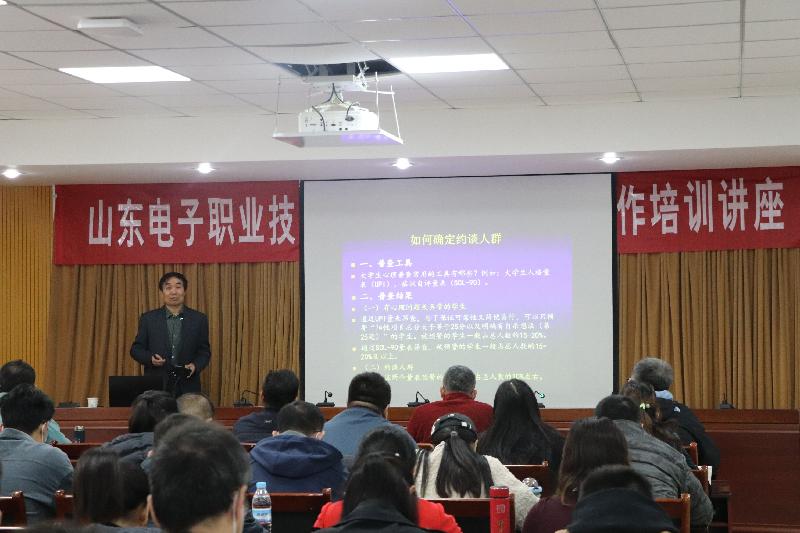 为深入学习宣传贯彻党的二十大精神,切实提升学校学生工作队伍素质能力和育人水平,11月9日上午,学校组织开展心理健康教育工作专题培训,聊城大学赵富才教授应邀担任培训主讲,各系党、团总支书记,全校辅导员、兼职班主任代表及学生工作处全体人员参加了培训。培训由学生工作处副处长王佩主持。