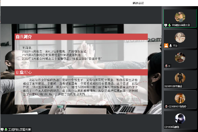 自媒体人高海涛同学分享到,他开朗外向的性格是促使他创业的原因之一,同时也想通过自己的努力让自己和家人过上更幸福的生活,在抖音发展的如火如荼之时抓住机会,开始带货;教育从业者王润田同学谈到,他的创业想法源自小时候的经历——“要是有个大哥哥大姐姐陪我长大、陪我学习就好了”,于是在高考结束后成立了K12培训机构,开始创业实践;助农团队发起者杨长数同学讲到,第一书记黄文秀的先进事迹鼓舞他要为乡村做些事情,自身专业也使他对电商助农有了认识,因此成立了“两山沃土创业团队”。