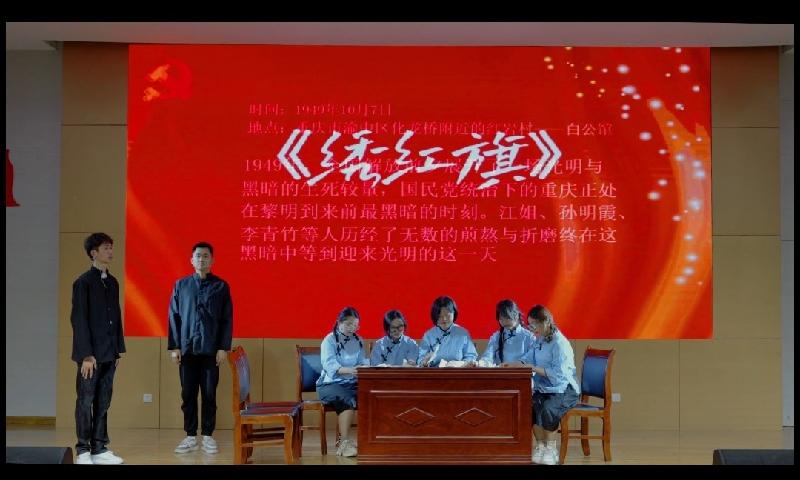 《绣红旗》主要展现了在渣滓洞女监中,江姐与战友们听闻中华人民共和国成立,决定绣一面五星红旗庆祝。“一颗金星绣在中央,光芒四射象征着党,四颗小星点缀四方,象征祖国大地一片光明一齐解放!”铿锵有力的台词打动了在场的每一位师生。“热泪随着针线走,与其说是悲不如说是喜.......”一针一线,凝聚成革命英雄对祖国的期盼和牵挂,那鲜艳的五星红旗飘扬在电院每个青年学子的心中。