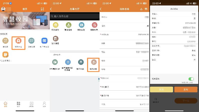 登录学校e电院首页,点击“移动办公”,点击 “法务在线”,按照指示填写内容并发布。