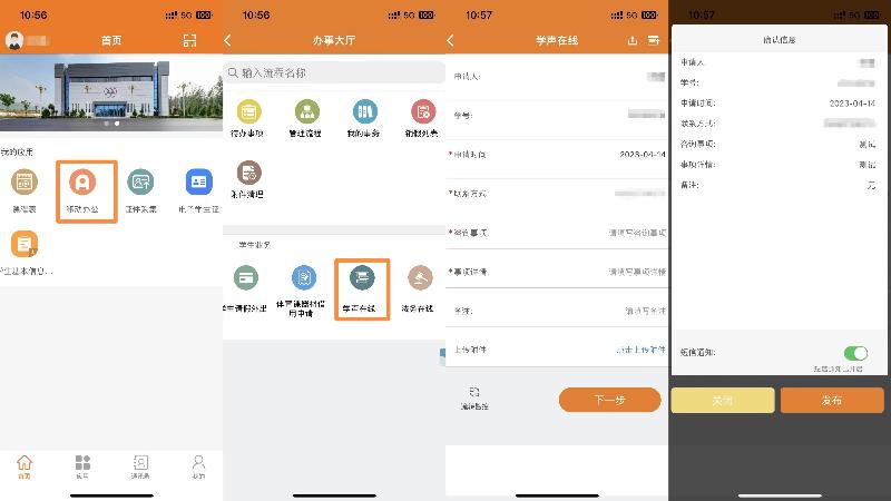 登录学校e电院首页,点击“移动办公”-“学声在线”根据提示填写诉求后发布。