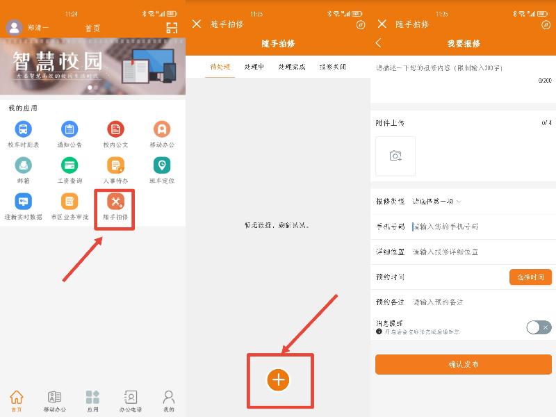 登录学校e电院首页,点击“随手拍修”,点击 “+”,按照指示填写内容并提交。