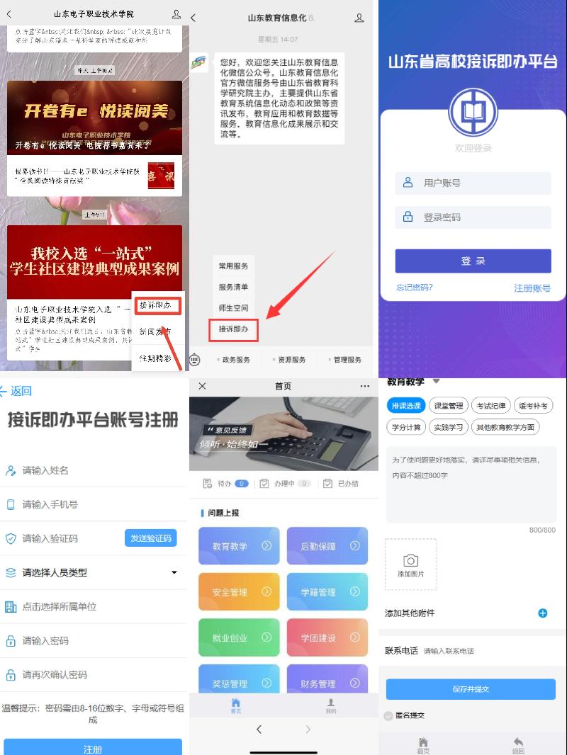 1.平台登录。微信搜索关注【山东电子职业技术学院】公众号,找到【掌上电院】-【接诉即办】菜单,或者微信搜索关注【山东教育信息化】公众号,找到【政务服务】-【接诉即办】菜单,点击菜单即可跳转至“山东省高校接诉即办平台”。