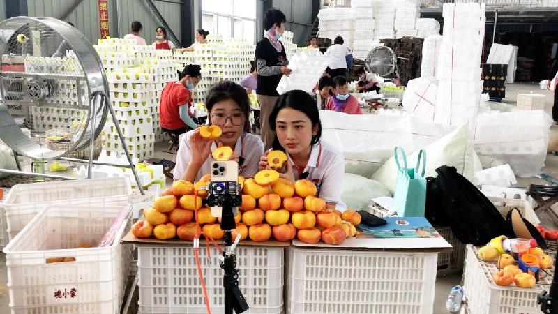 “大家好,欢迎来到‘e心慧农’的直播间。今天我们带来的是蒙阴蜜桃彩虹蟠,每只四两多重,汁水饱满鲜甜,赶紧下单尝一尝吧!”实践团主播娄方明同学全情投入,直播间订单络绎不绝。
