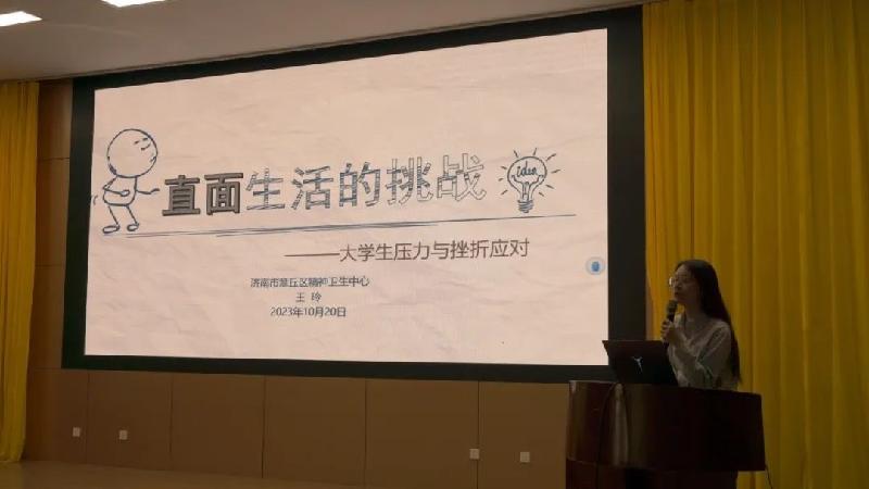 章丘区精神卫生中心工会主席,精五区胡晓花主任为同学们带来《大学新生如何做好心理保健-焦虑抑郁情绪的早期识别》讲座,带领同学们认识焦虑和抑郁情绪以及日常缓解不良情绪的方法。王玲医生的报告以《直面生活的挑战–大学生压力与挫折》为主题,引导同学们结合自身情况正确认识压力,学习正确缓解压力的方法,保持健康和谐的阳光心态。