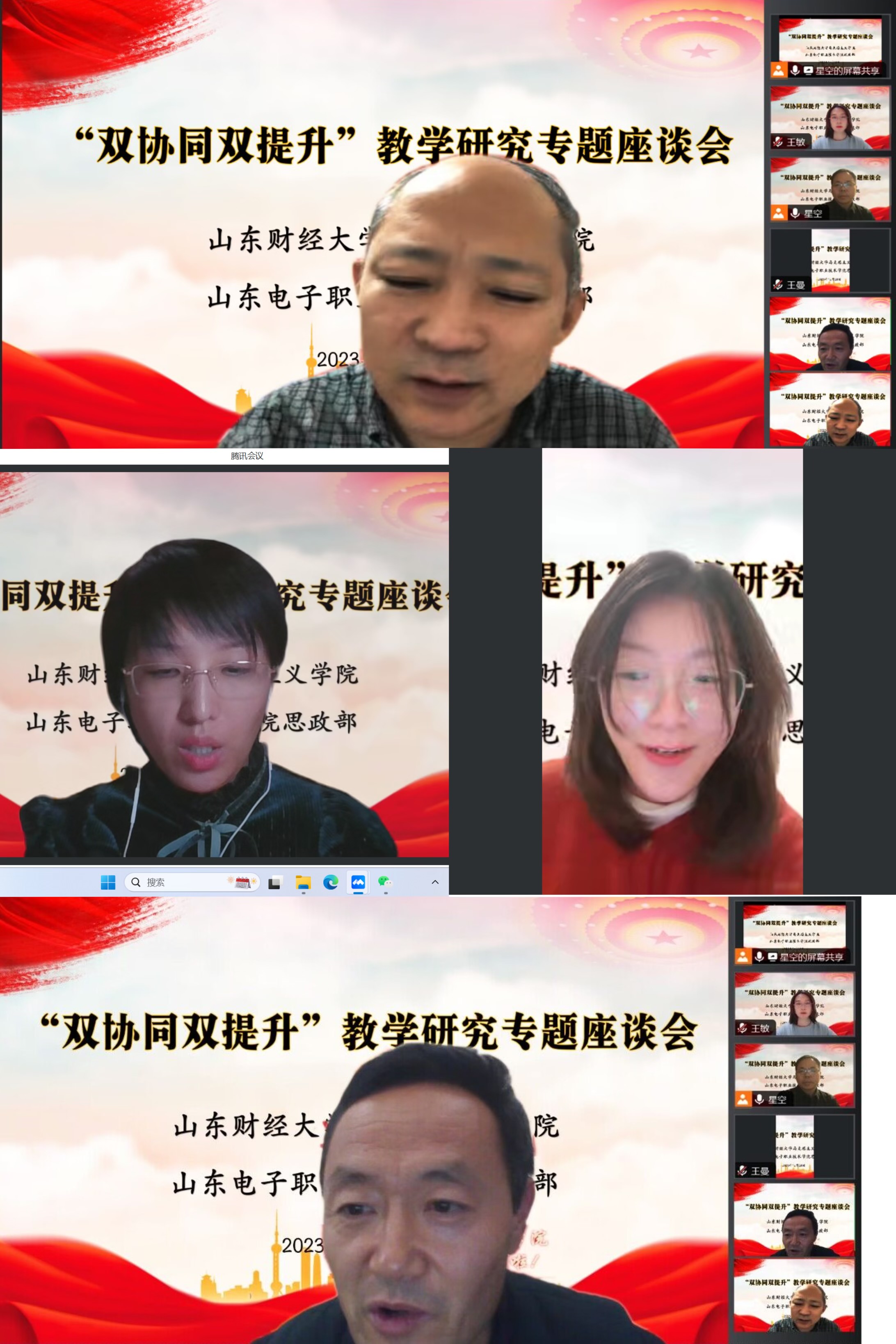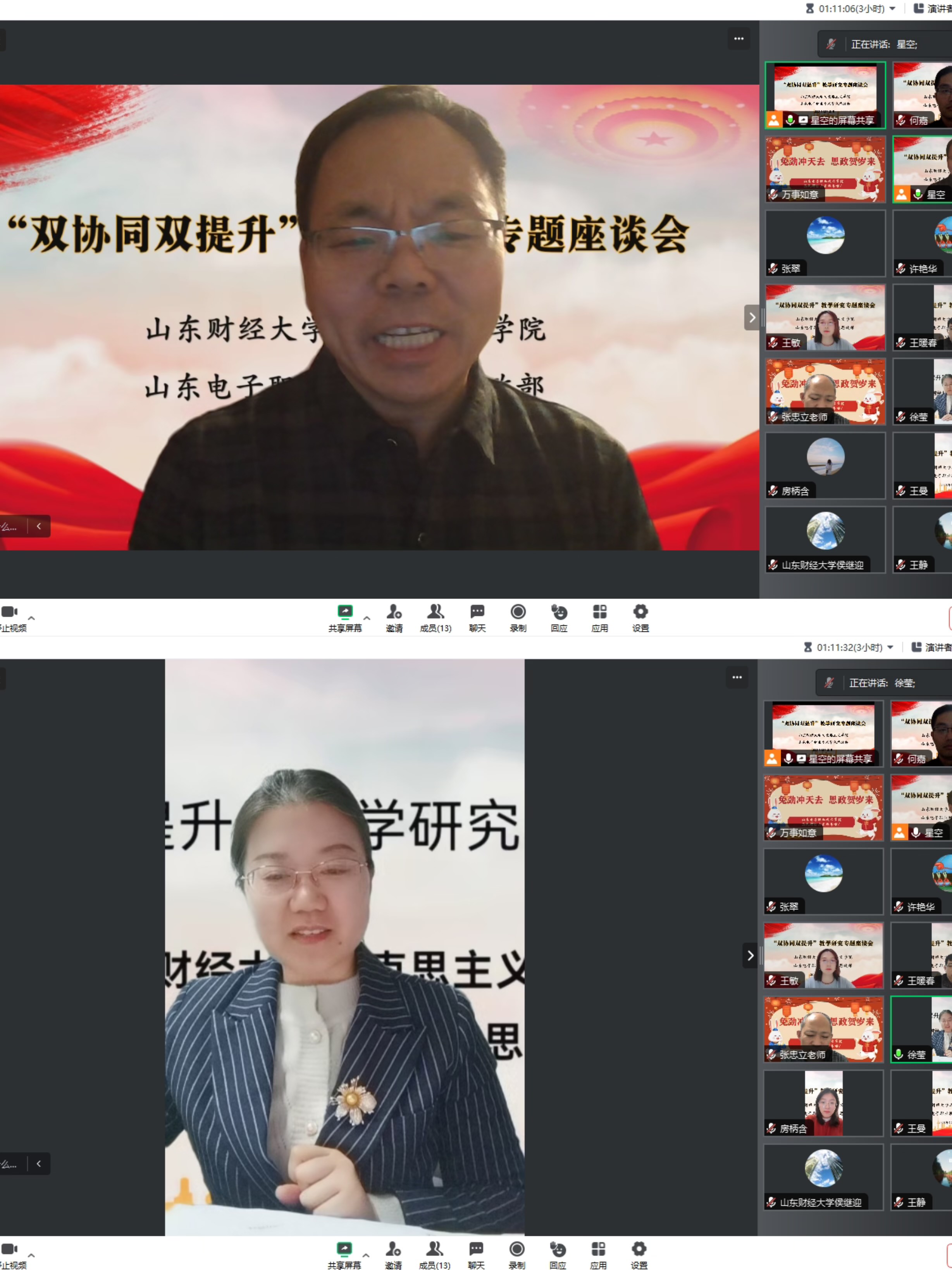 为深入贯彻习近平总书记关于教育的重要论述特别是学校思政课教师座谈会精神,认真贯彻落实《山东省大中小学思政课“双协同、双提升”项目工作方案》的要求,我校思政部与山东财经大学马克思主义学院于12月28日联合举办“双协同、双提升”教学研究专题座谈会云端会议,我校思政部主任张同胜、山东财经大学马克思主义学院院长徐莹等部门负责人,两校思政课教研室主任及青年教师代表参加了座谈会。会议由我校思政部主任张同胜主持。