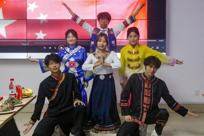 一群身着民族特色服饰的学生也来到现场,载歌载舞,展示出各民族文化和服饰的魅力,引起现场掌声雷动。