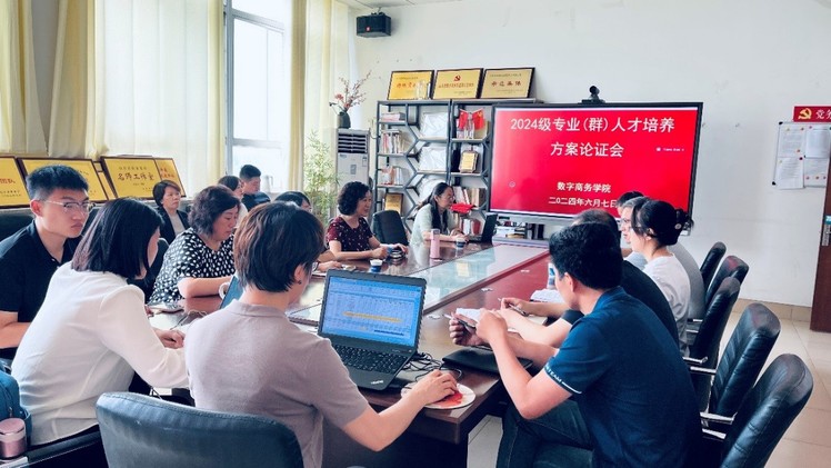 为高质量完成2024级专业(群)人才培养方案编制工作,6月7日上午,数字商务学院在综合楼408会议室召开2024级专业(群)人才培养方案论证会,基础教学部主任任文娟、思想政治课教学部主任张同胜和行业企业代表参会指导,数字商务学院全体干部、教研室主任、专业负责人以及部分骨干教师参加了论证会。会议由数字商务学院院长李敏主持。