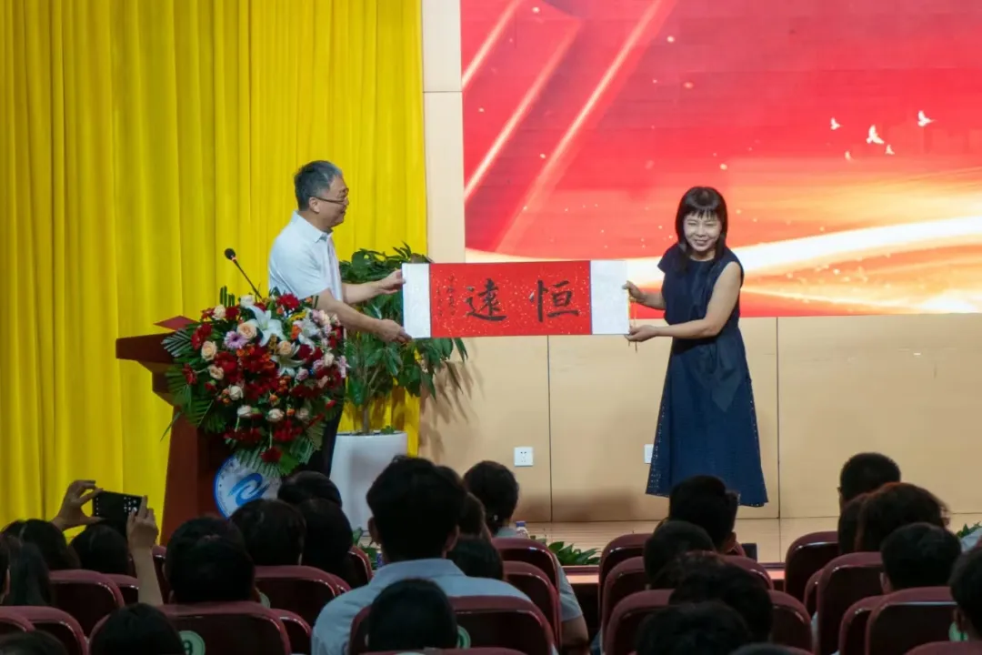 毕业生马卓群的母亲王霞女士作为家长代表发言。她表达了对学校培养的感谢,对毕业生同学们的祝福,也对同学们提出期望,并将亲手撰写的“恒远”二字赠予学校,展现出“家校同心,合力共育”的和谐画面。