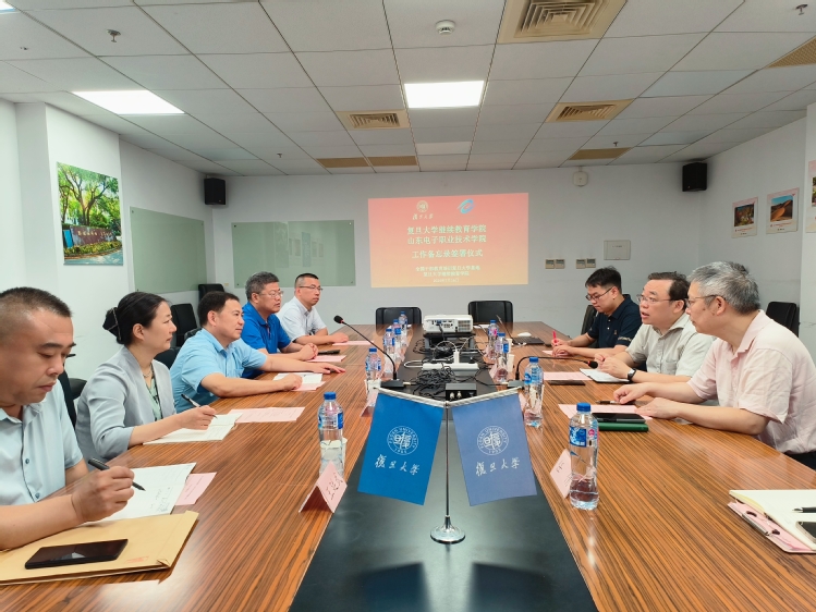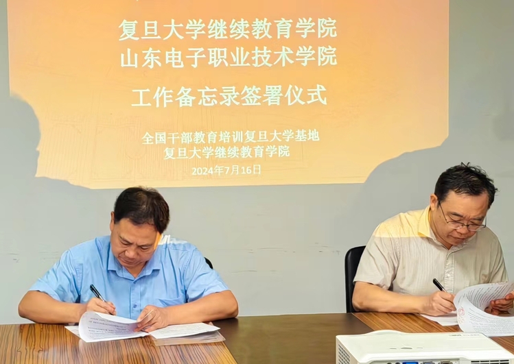 为了适应新时代职业教育新形势、新发展、新要求,共同推动教育资源共享与人才联合培养,7月16日,山东电子职业技术学院与复旦大学继续教育学院签署工作备忘录协议。山东电子职业技术学院院长张建臣、副院长梁会亭,复旦大学继续教育学院院长胡波、副院长葛宏波及双方相关部门负责人出席签约活动。
