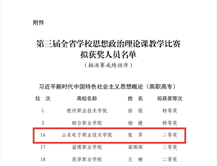 7月20日至21日,第三届全省学校思想政治理论课教学比赛在山东大学(中心校区)举行,我校思政课教师张翠参赛并荣获“习近平新时代中国特色社会主义思想概论”(高职高专组)二等奖。