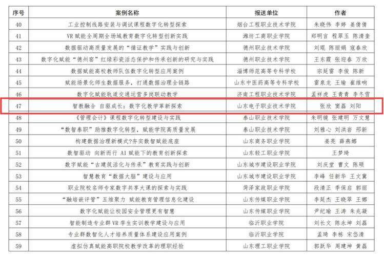 近日,山东省教育厅发布《关于公布2024年数字化赋能教育管理信息化建设与应用典型案例评选结果的通知》(鲁教科函〔2024〕33号),我校选送的《智教融合自驱成长:数字化教学革新探索》案例获评优秀典型案例。
