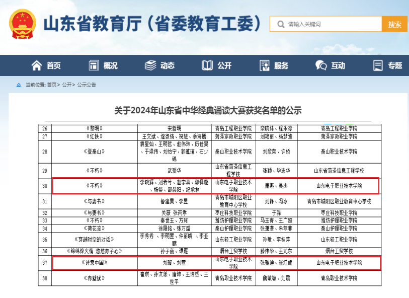 诵读古今经典,弘扬中国精神。近日,省教育厅官网发布《关于2024年山东省中华经典诵读大赛获奖名单的公示》,我校由康燕、吴杰指导的《不朽》和由张雅迪、崔红健指导的《诗意中国》两个参赛作品获得三等奖。