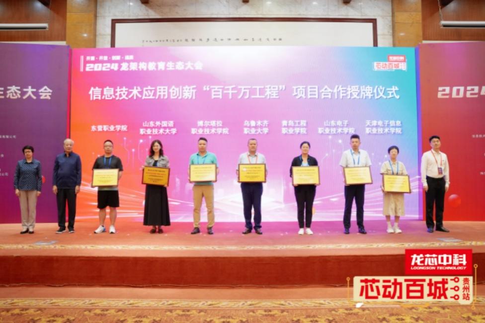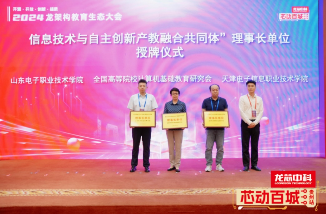 会议现场举办信息技术应用创新“百千万工程”项目合作授牌仪式,全国高等院校计算机基础教育研究会和龙芯中科联合向我校进行首批“信息技术应用创新产教融合实践中心”授牌。