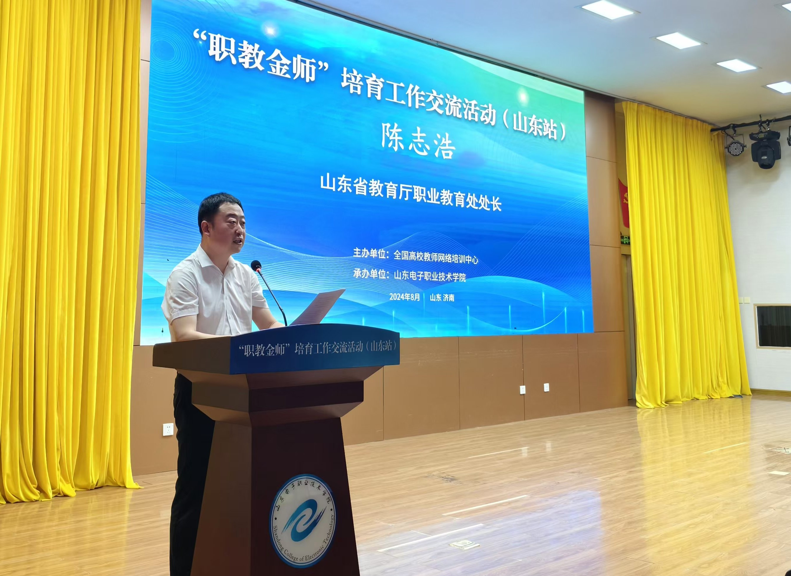 为推进落实教育部关于加强新时代教师队伍建设和推动现代职业教育高质量发展的部署要求,做好“职教金师”培育工作,8月21日,由全国高校教师网络培训中心主办,山东电子职业技术学院承办的“职教金师”培育工作交流活动(山东站)在学校学术报告厅成功举办。省内20余所相关职业院校领导、嘉宾、教师共200余人参加交流活动。活动由山东电子职业技术学院党委委员、副校长梁会亭主持。