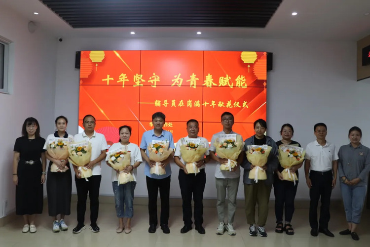 座谈会现场,李卫东为工龄超过十年的资深辅导员代表送上鲜花和祝福,高度赞扬了他们十年如一日的坚守与奉献,强调了他们以热爱与担当践行育人使命的优秀品质。
