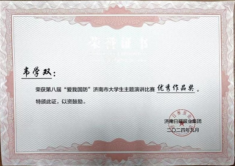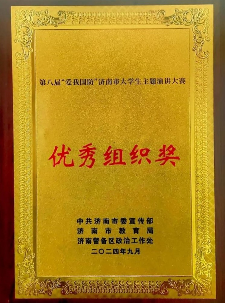 近日,由中共济南市委宣传部、济南市教育局、济南市国防动员办公室、济南警备区政治工作处联合主办,济南日报报业集团承办的第八届“爱我国防”济南市大学生主题演讲大赛暨“爱我国防长城—2024”济南市国防教育知识竞赛颁奖仪式在济南举行。我校荣获“优秀组织奖”,大数据与人工智能学院学生韦学双《强我国防,在军营书写绚烂无悔的青春》获得“优秀作品奖”。