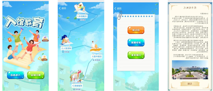 我校图书馆通过微信公众号发布《2024新生入馆须知》,同时为了增强学习的互动性和趣味性,与超星联合搭建入馆教育微信小程序,通过互动闯关模式让新生学习图书借阅流程与规则、电子资源使用等内容,全面了解图书馆的各项功能与服务。