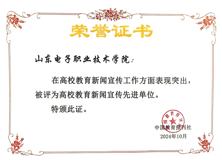 10月18日,中国教育报刊社山东新闻宣传通联工作会议在泰安召开,会上对先进单位和先进个人进行了表彰。山东电子职业技术学院被评为2024年度高校教育新闻宣传先进单位,一人获评高校教育新闻宣传先进个人。