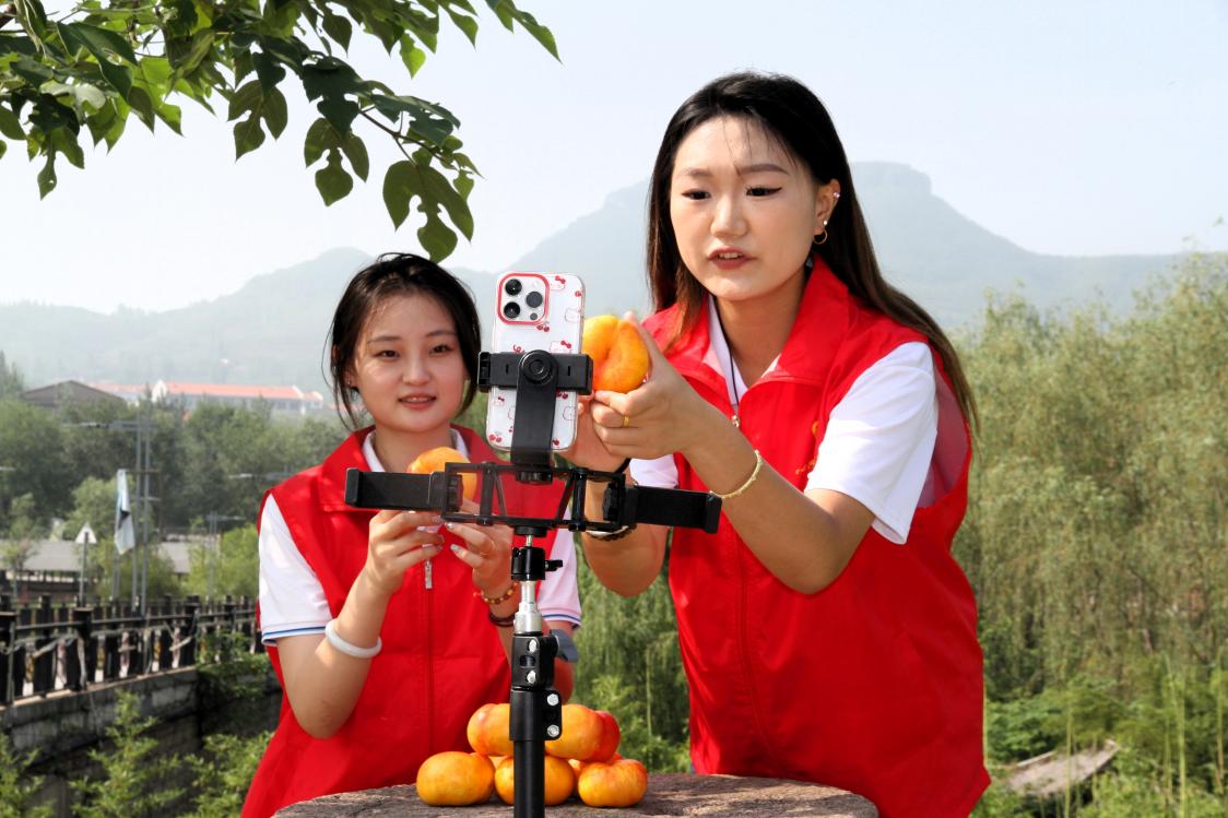 e心兴农服务队正在田间地头开设直播间推广蒙阴蜜桃