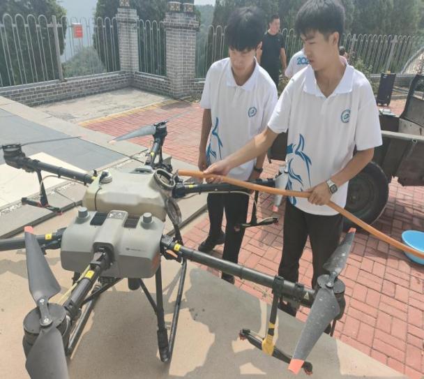 “智飞未来”社会实践队成员正在为植保无人机添加药剂、喷洒农药