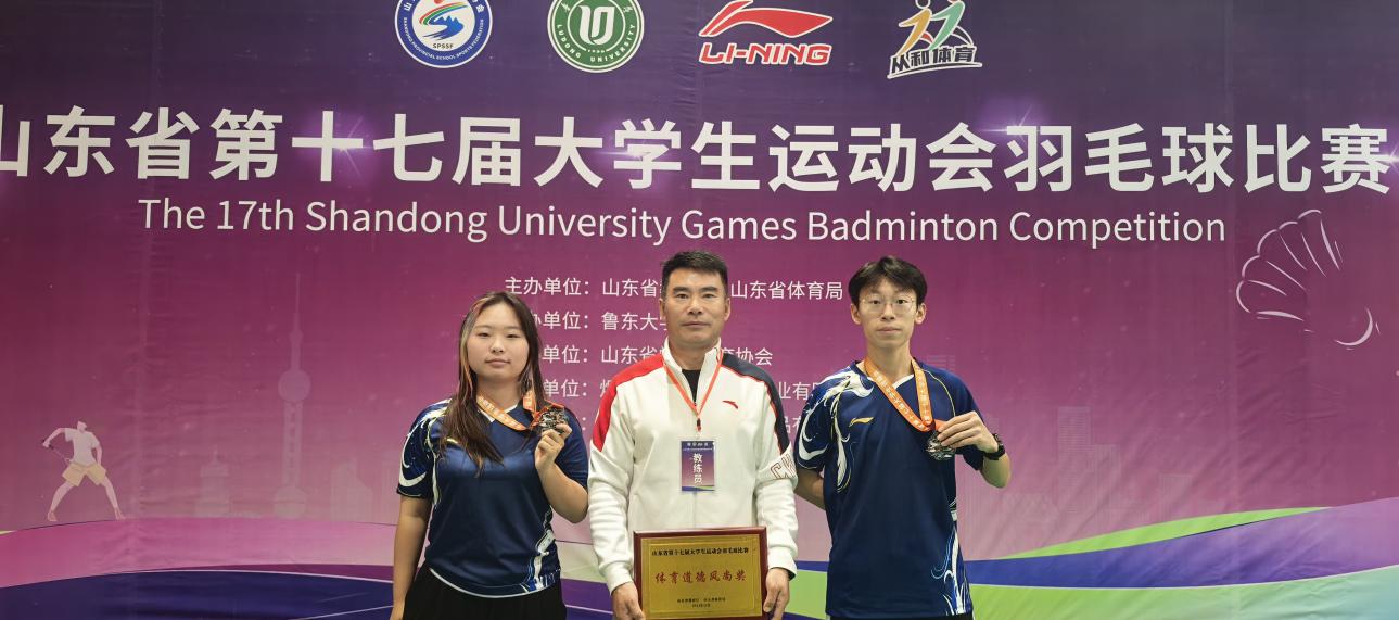 11月12日,山东省第十七届大学生运动会羽毛球比赛(乙组)成绩揭晓,我校数字商务学院学生张庆松、滕子跃在基础教学部体育组教练团队组织训练下,由王清华老师带队并现场指导,历经六天赛程的激烈比拼,取得混双比赛铜牌、男子单打第四的好成绩。学校代表队喜获“体育道德风尚奖”!