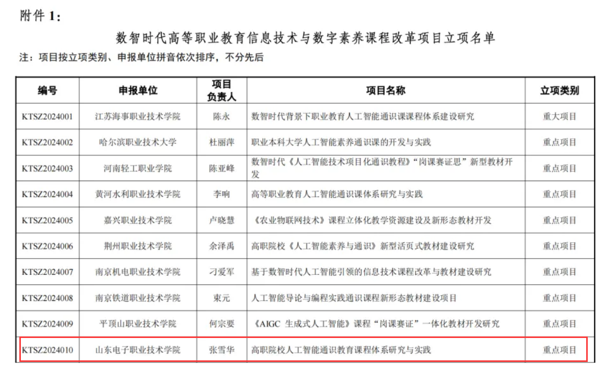 近日,教育部职业院校信息化教学指导委员会官网发布《关于公布数智时代高等职业教育信息技术与数字素养课程改革项目立项名单的通知》,经专家评议、结果公示,我校大数据与人工智能学院教师张雪华立项重点项目1项。