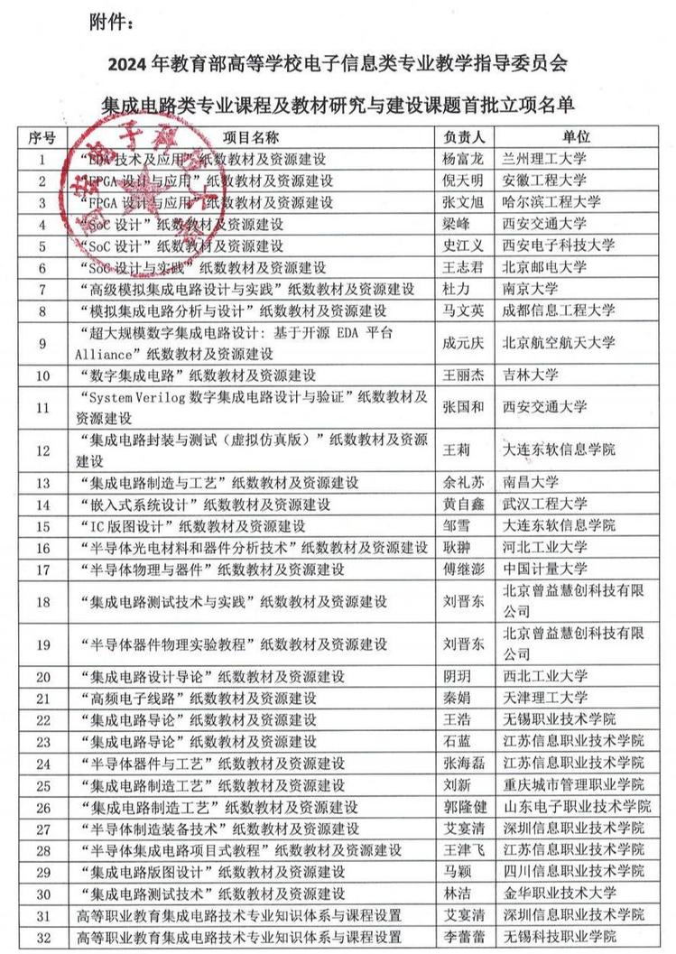 11月26日,我校在专业建设再传喜讯,成功立项了2024年教育部高等学校电子信息类专业教学指导委员会集成电路类专业课程及教材研究与建设课题,这一成果标志着我校在集成电路专业发展上迈出了坚实且重要的一步。