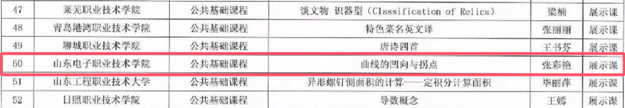 近日,山东省职业技术教育学会公布了2024年度山东省职业教育优质课培育线上展示作品评选结果,我校张彩艳老师的《曲线的凹向与拐点》、孟建明老师的《新零售无人智能配送车的数字化设计》被认定为展示课。