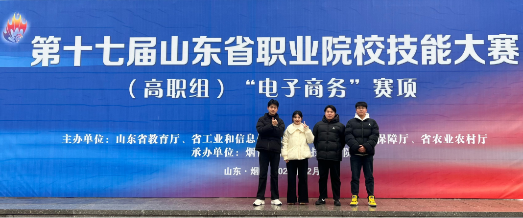 12月16日至18日,第17届山东省职业院校技能大赛高职组“电子商务”赛项在烟台工程职业技术学院举行。全省共有65所院校参赛,我校数字商务学院李敏、刘林老师指导的由郭浩、孙晓娣、李昱成、杨志浩同学组成的学生团队凭借优秀表现斩获一等奖第三名。