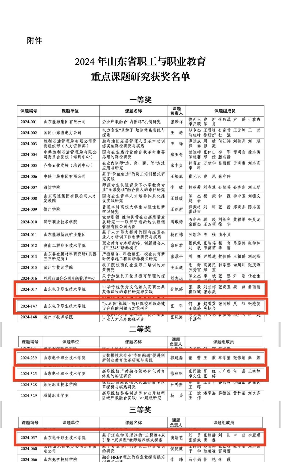12月22日,山东省职工与职业教育协会公布了2024年山东省职工与职业教育重点课题研究结题及评选结果,我校前期立项的《中华传统优秀文化融入高职公共英语课程的路径研究与实践》等5项重点课题全部顺利结项,研究成果获评一等奖2项、二等奖2项、三等奖1项。