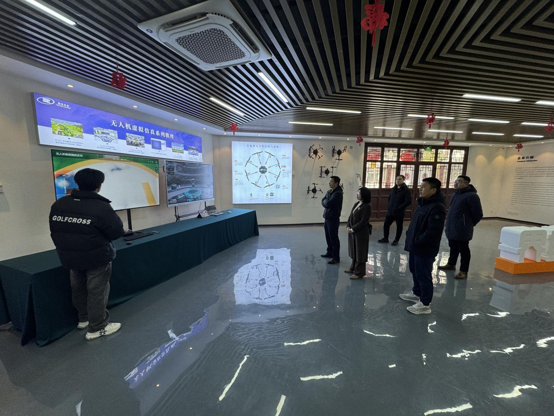 在顺然科技展厅,调研团队参观了各类无人机设备,观看了动态飞行演示、交互实训仿真、VR视觉仿真、数字孪生系统演示等前沿设备,这些设备系统体现了无人机领域前沿成果,为无人机专业教学与实践提供新思路。