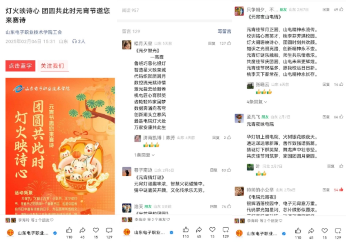 当数字科技邂逅千年诗韵,会碰撞出怎样的文化火花?元宵节期间,灯火映诗心 团圆共此时主题赛诗活动在学校新媒体平台火热开展,通过云端赛诗会的创新形式,让传统文化焕发时代光彩,在教职工群体中掀起以诗会友庆团圆的文化热潮。