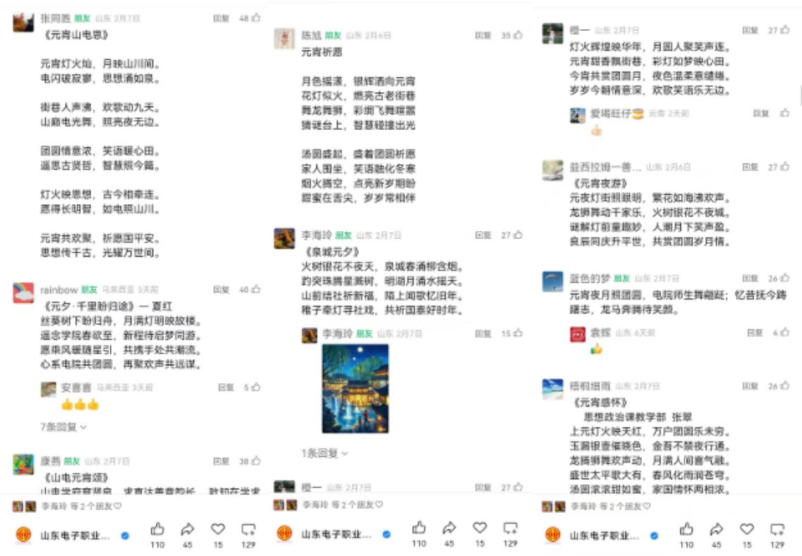 作为活动承办方,数字商务学院分工会巧借新媒体传播优势,依托学校工会微信公众号搭建云端诗社,创新设置了“即兴创作+互动点赞”的数字化参与模式。教职工们热情高涨,或即兴挥毫创作原创诗词,或化身当代推敲客字斟句酌,将家国情怀、教育理想、佳节愿景融入平仄韵律。据统计,活动期间累计收到诗词作品120余首,留言区互动量达上千人次,精选作品单篇最高获赞达127次。这场别开生面的“云端诗会”实现三重文化效应:一是以“赛”促创,激发了教职工对诗词的热爱和创作热情;二是以“云’为媒,构建了传统文化传承新场景;三是以“情”聚力,通过共赏诗韵增强集体认同。正如参赛教师所言:在平仄对仗中触摸文化基因,于互动点赞间感受同事情谊,这个元宵节过得格外风雅。