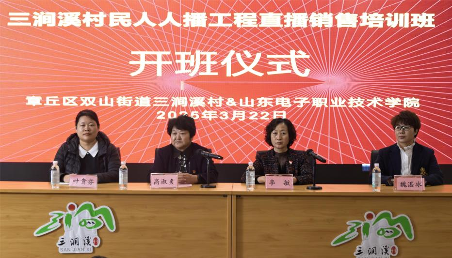 为紧跟数字经济发展浪潮,助力三涧溪村人才振兴,带动三涧溪村产业发展和文化振兴,3月22日,我校为三涧溪村定制的村民人人播工程直播销售培训班正式开班。三涧溪村党委书记高淑贞、山东电子职业技术学院数字商务学院院长李敏,以及数字商务学院网络营销与直播电商专业负责人、参训村民参加开班仪式。