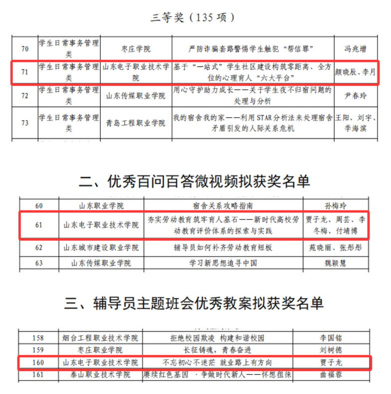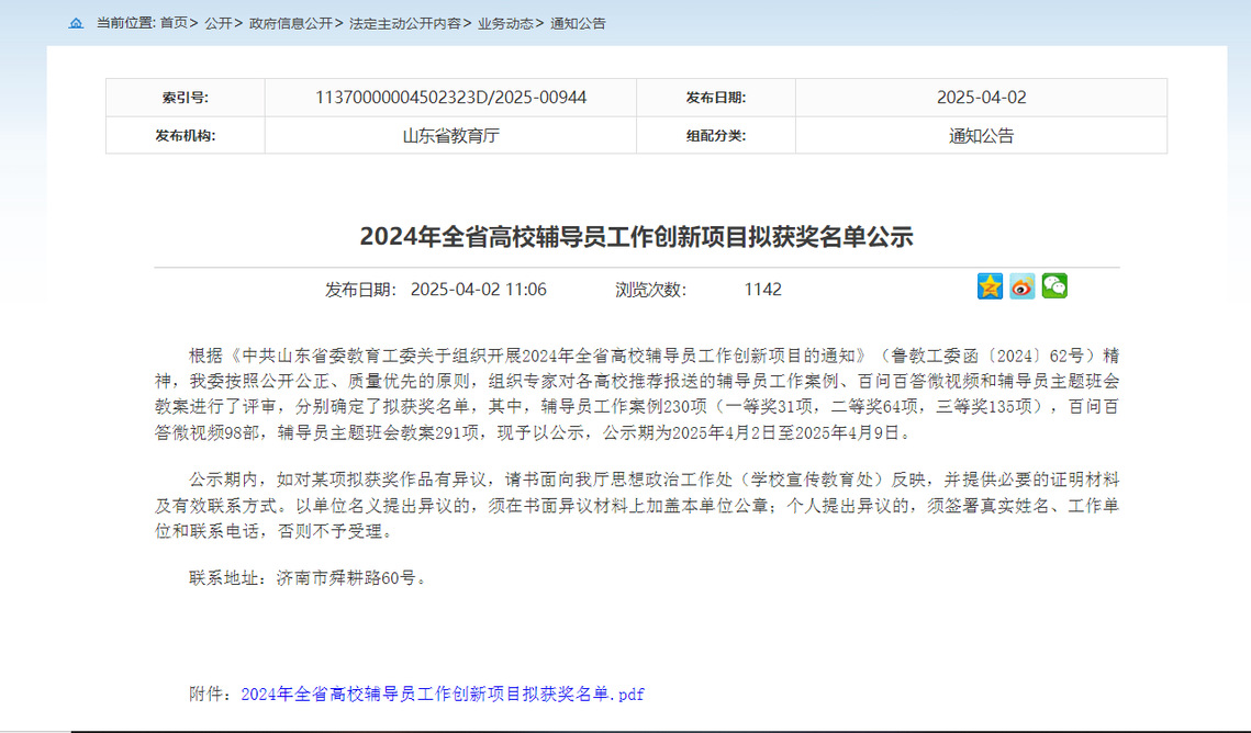 近日,在山东省教育厅(省委教育工委)发布的《2024年全省高校辅导员工作创新项目拟获奖名单公示》中,我校5项作品获奖,其中辅导员工作优秀案例二等奖2项、 三等奖1项,优秀百问百答微视频1项,辅导员主题班会个人作品优秀教案1项。