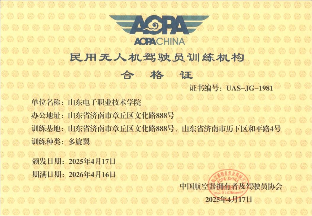 此项资质突破不仅夯实了学校作为山东省低空技术应用人才培养高地的战略地位,更为区域低空经济产业升级提供人才支撑。未来,我校将依托校级科研平台—低空技术研究院的资源优势,发挥辐射带动效应,着力培养更多高素质无人机专业人才,为推动职业教育高质量发展与低空经济产业升级贡献力量。(大数据与人工智能学院 张伟娟 常英丽)