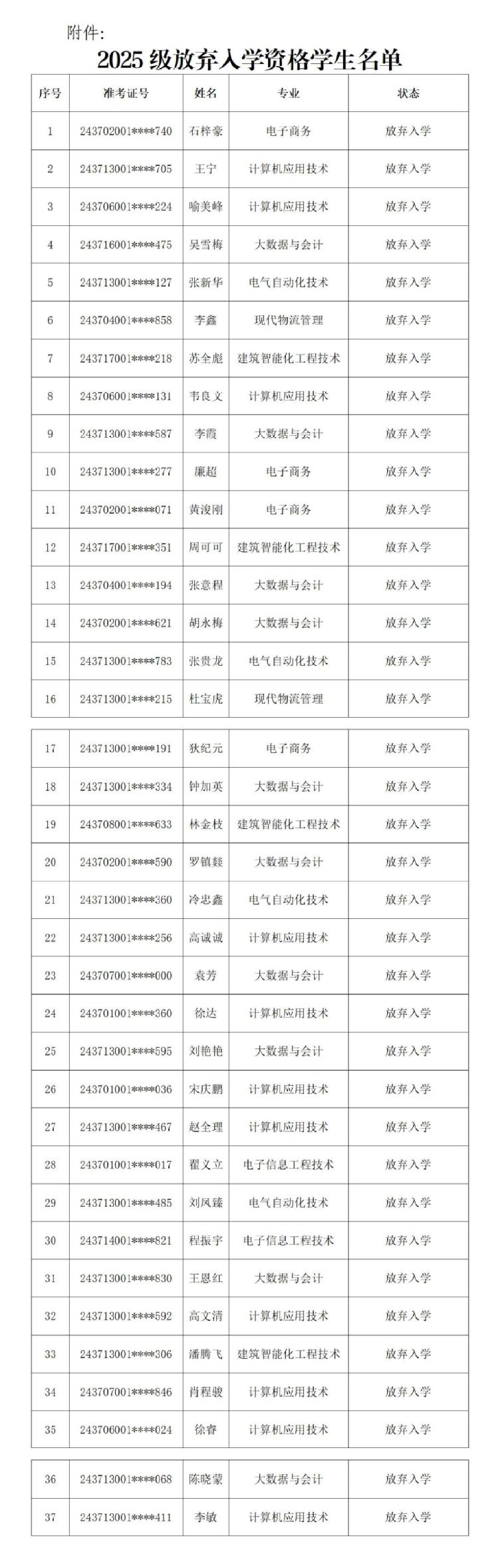 我校2025级高等学历继续教育新生报到缴费工作已经结束。截止目前仍有部分学生没有按规定办理报到缴费手续。经核查,共有37名新生存在以下情况:逾期未办理报到缴费手续且未履行请假程序,或已明确声明放弃入学资格。根据高等学历继续教育学籍管理的有关规定,将视为自动放弃入学资格,不予注册学籍,现予以公示。