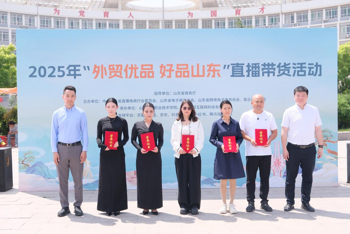 2025年5月15日,由山东省商务厅指导,中共山东省直播电商行业委员会、山东省电子商务协会、山东省跨境电子商务协会、章丘区商务局联合主办,我校与济南潮音互联网科技有限公司共同承办的外贸优品·好品山东直播带货进校园活动在校园广场启幕。本次活动获得天猫、淘宝、京东、抖音、快手、小红书、腾讯视频号等电商平台支持,吸引全省50余家优质企业携外贸优品、非遗老字号、特色工艺品参展,既为消费者呈现品质盛宴,也为师生搭建了行业实践平台。