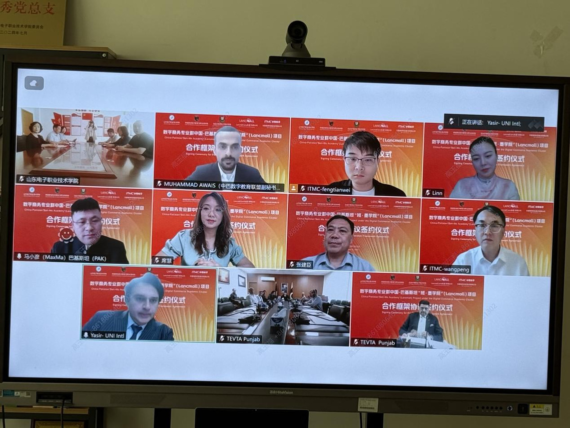 5月15日,我校与神灯科技(Lancmall)(smc私营)有限公司,巴基斯坦旁遮普省技术教育与职业培训局、拉合尔政府女子技术学院,中教畅享科技股份有限公司签署数字商务专业群中国-巴基斯坦“班·墨学院”(Lancmall)合作框架协议。山东电子职业技术学院院长张建臣,国际交流与合作部、数字商务学院负责人及相关人员参加仪式。