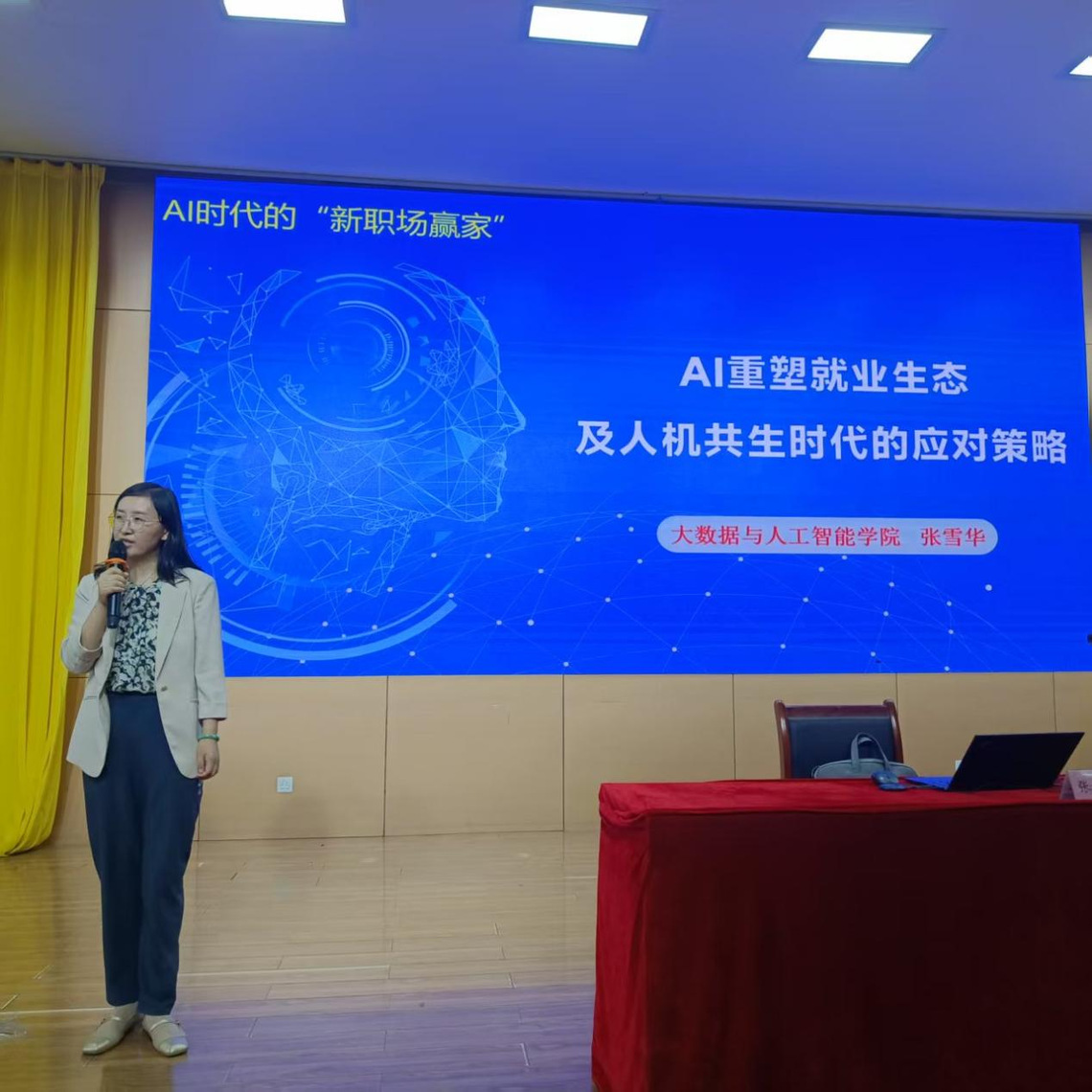 讲座以“AI 重塑就业生态及人机共生时代的应用策略”为主题,系统阐释了人工智能技术对当代就业市场的颠覆性影响与前瞻性机遇。张雪华从人工智能的技术本质与发展脉络切入,结合产业智能化转型趋势,深度剖析了AI驱动下的职场变革图景。她鼓励青年学子主动突破“技术恐慌”心理,通过“了解AI技术边界—掌握工具使用逻辑—构建人机协作模式”的进阶路径,以“专业深度×技术宽度”的复合型思维应对挑战。
