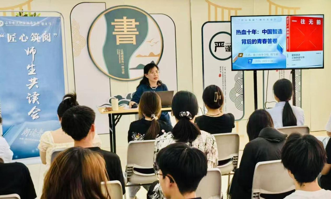 共读期间,周雪莉在与在座读者分享书中生动事例的过程中,展现了雷军作为创业者逐步升级蜕变、为初心披荆斩棘、一往无前的创业历程。她还结合自身教学经验与行业观察,对书中关键情节和重要理念进行了深入剖析。周雪莉表示,雷军的成功不仅源于个人才华与努力,更在于他始终秉持的“匠心精神” 和对行业发展趋势的精准把握。“一往无前” 不仅是一种创业精神,更是面对人生挑战应有的态度,这对于高职院校的学生而言尤为重要。