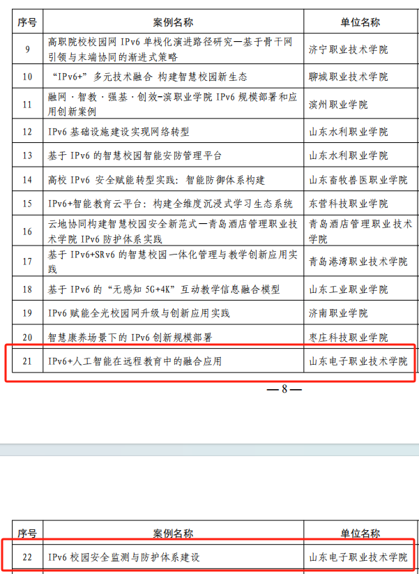近日,山东省教育厅公布了山东省教育系统“IPv6/IPv6+”典型创新应用案例评选结果,我校网络信息中心牵头编写的《IPv6+人工智能在远程教育中的融合应用》《IPv6 校园安全监测与防护体系建设》两个案例全部成功入选。